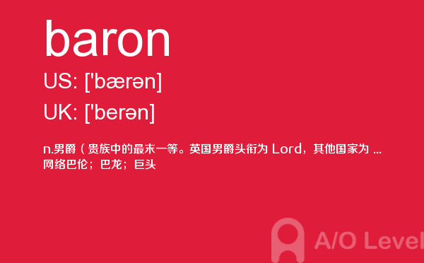 英国高中课程(a-level)的学制为两年:第一年称为as水准,学生通常选择自己最擅长且最有兴趣的3—4门课,通过考试后获得as证书。第二年称为a2水准,学生可选择as水准中优秀的3门课继续学习,通过考试后获得a-level证书。关于a-level学制相信大家肯定有一定的了解,今天alevel考试网想要带大家了解的并不是a-level学制的问题,想要介绍的是a-level重难点单词baron,希望对大家有帮助。如果您想了解alevel经济essay,alevel成绩有效期,alevel进阶数学分数段,什么是alevel课程等关于a-level考试的相关资讯,请继续浏览并关注课窝a/o-level考试网。