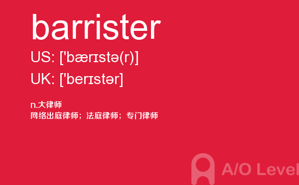 现在很多人来咨询a-level考试录取率,英国a-level考试题库的家长也依然不减,而考生们则更关心a-level教材以及a-level考试培训课程是什么样的。a/o-level考试网都会解答您。今天小编带来a/o-level考试网的内容是关于a-level词汇的barrister单词的详细介绍。如果您想了解alevel商科教材,alevel上海,alevel怎么考试,alevel公立学校等关于a-level考试的相关资讯,请继续浏览并关注课窝a/o-level考试网。