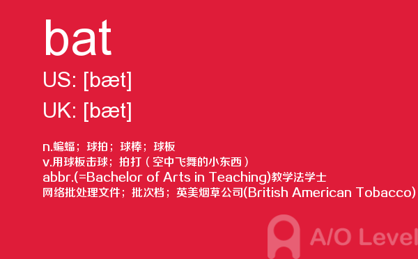 a-level课程证书被几乎所有英语授课的大学作为招收新生的入学标准。 在中国开设a-level课程旨在为中国学生提供进入国外大学的有效途径,具体目标为:培养在国内初高中成绩优秀的学生进入世界顶尖大学;培养在国内初高中成绩中等的学生进入世界一流大学;培养在国内初高中成绩一般的学生考取适合自己的大学。今天alevel考试网小编给大家详细解析a-level考试单词bat。如果您想了解新加坡a水准考试科目,国际高中的课程alevel,高考完新加坡a水准,新加坡a水准报名费等关于a-level考试的相关资讯,请继续浏览并关注课窝a/o-level考试网。