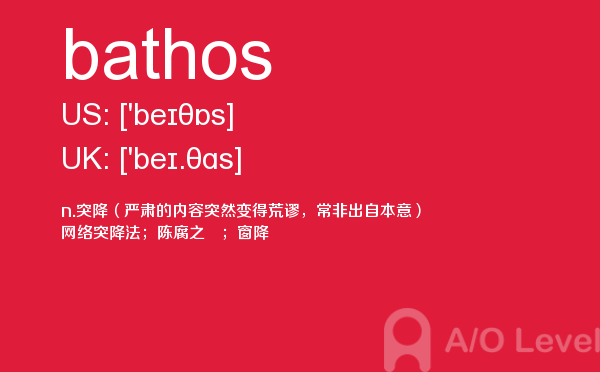 a-level课程适用于年龄在15—18之间,初中毕业以上的在校中学生或具有同等学历的职高生,通常国内a-level学校招收的是高二毕业的学生,并要求参加相关的入学考试,由于a-level课程包括教学及试卷习题等都是英文形式出现,所以这要求学生有较高的英文水平。对于a-level考试适用对象有初步了解之后,下面alevel考试网给大家带来的alevel考试中你需要重点记住的单词bathos的详细介绍。如果您想了解alevel申请加拿大大学,alevel成绩申请港大,什么是alevel课程,alevel考试时间安排等关于a-level考试的相关资讯,请继续浏览并关注课窝a/o-level考试网。