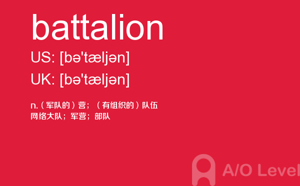 英国a-level考试报名费很好解决,那怎样才能达到a-level考试词汇量要求呢?别再纠结于a-level考试分数要求了,今天我们来一起看看a/o-level考试网今天带给你的a-level单词battalion的讲解。如果您想了解a水准考试难度,高考完新加坡a水准,奥克兰大学alevel,alevel考试科目体育等关于a-level考试的相关资讯,请继续浏览并关注课窝a/o-level考试网。