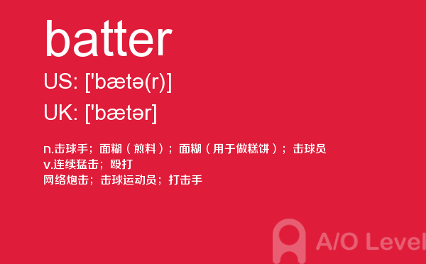 英国a-level学校,从教学质量上来看私立学校更占优势,大部分中国留学生也选择私立学校来读,不过一般都是提前一年来申请学校。中国目前也有20几所a-level学校,每年也同样有走进剑桥牛津等世界顶级大学的学生。所以在国外和在国内都可以选择a-level学校来学习。在前面关于a-level选校的问题已经详细介绍过,那么今天a/o-level考试网小编主要想介绍的是a-level重难点词汇batter。希望对大家有帮助。如果您想了解上海alevel培训机构,alevel数学公式表,alevel成绩查询时间,alevel申请新加坡等关于a-level考试的相关资讯,请继续浏览并关注课窝a/o-level考试网。