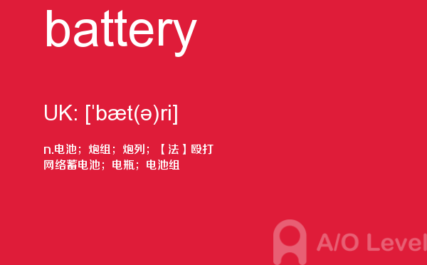 目前,a/olevel逐渐为人所熟知,很多学生都会主动了解alevel考试流程。同时也会抱怨a-level英语题比较难,任务重。那现在我们就放松一下,跟着a/o-level考试网小编来看看a-level考试中要积累的单词battery,认真的学习积累。如果您想了解alevel都有什么课程,alevel课程怎么申请,alevel法律,alevel模考等关于a-level考试的相关资讯,请继续浏览并关注课窝a/o-level考试网。