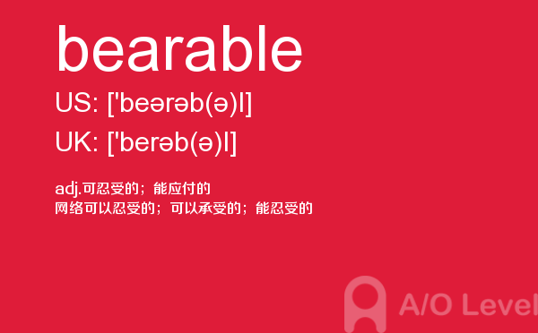a-level课程证书被几乎所有英语授课的大学作为招收新生的入学标准。 在中国开设a-level课程旨在为中国学生提供进入国外大学的有效途径,具体目标为:培养在国内初高中成绩优秀的学生进入世界顶尖大学;培养在国内初高中成绩中等的学生进入世界一流大学;培养在国内初高中成绩一般的学生考取适合自己的大学。今天alevel考试网小编给大家详细解析a-level考试单词bearable。如果您想了解alevel经济学真题,a水准认可英联邦国家,查询alevel考试报名信息2018,alevel数学怎么选等关于a-level考试的相关资讯,请继续浏览并关注课窝a/o-level考试网。