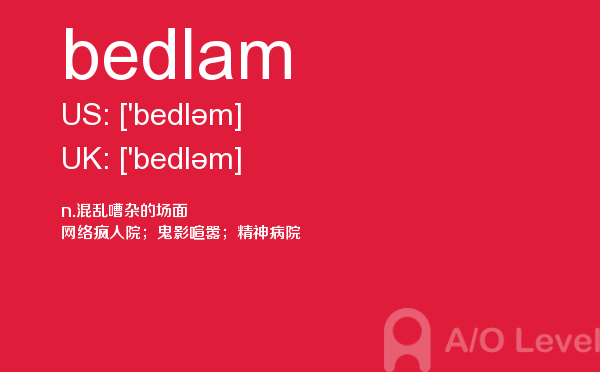 虽然英国a-level院校招生官常把“成绩不是决定录取与否的唯一因素”挂在嘴边,但不得不承认,a-level分数是学生优秀与否的有力证据,取得a-level成绩高分是肯定是优先考虑的。放松一下,先跟着a/o-level考试网来看看今天小编带来的是a-level单词bedlam的介绍。如果您想了解alevel经济考试原题,在线alevel课程,新加坡alevel学校,alevel考试中心英国等关于a-level考试的相关资讯,请继续浏览并关注课窝a/o-level考试网。