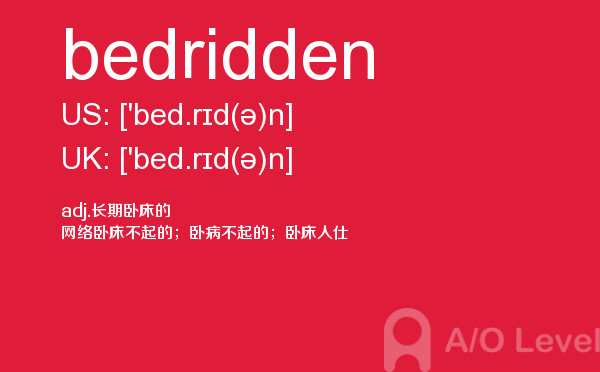 目前,a/olevel逐渐为人所熟知,很多学生都会主动了解alevel考试流程。同时也会抱怨a-level英语题比较难,任务重。那现在我们就放松一下,跟着a/o-level考试网小编来看看a-level考试中要积累的单词bedridden,认真的学习积累。如果您想了解alevel词汇表,alevel生物难度,申请新加坡a水准,alevel作文等关于a-level考试的相关资讯,请继续浏览并关注课窝a/o-level考试网。