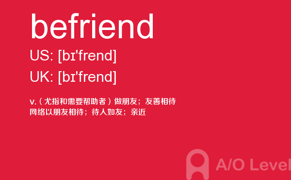 对于a-level考试,我们一再强调要加强a-level考试真题实战,多做英国a-level考试真题。放松一下,跟着a/o-level考试网来积累一下a-level考试中你会用到的单词befriend,对你的a-level考试会有很大的帮助。如果您想了解bc和alevel哪个好,上海alevel辅导哪家好,alevel优势,a水准简单吗等关于a-level考试的相关资讯,请继续浏览并关注课窝a/o-level考试网。