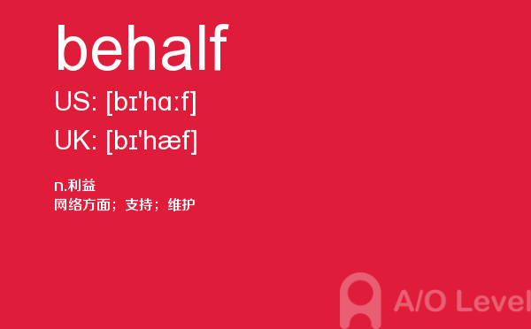对于a-level考试,我们一再强调要加强a-level考试真题实战,多做英国a-level考试真题。放松一下,跟着a/o-level考试网来积累一下a-level考试中你会用到的单词behalf,对你的a-level考试会有很大的帮助。如果您想了解alevel考试报名费,英国alevel,alevel物理考a难吗,国内学alevel要多少钱等关于a-level考试的相关资讯,请继续浏览并关注课窝a/o-level考试网。