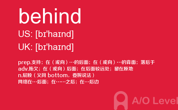 英国a-level学校,从教学质量上来看私立学校更占优势,大部分中国留学生也选择私立学校来读,不过一般都是提前一年来申请学校。中国目前也有20几所a-level学校,每年也同样有走进剑桥牛津等世界顶级大学的学生。所以在国外和在国内都可以选择a-level学校来学习。在前面关于a-level选校的问题已经详细介绍过,那么今天a/o-level考试网小编主要想介绍的是a-level重难点词汇behind。希望对大家有帮助。如果您想了解alevel写作真题,上海alevel学校,alevel考试的考生年龄上限是多少,alevel费用等关于a-level考试的相关资讯,请继续浏览并关注课窝a/o-level考试网。