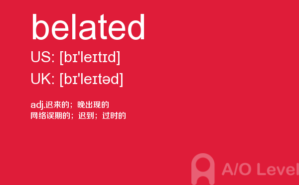 a-level课程证书被几乎所有英语授课的大学作为招收新生的入学标准。 在中国开设a-level课程旨在为中国学生提供进入国外大学的有效途径,具体目标为:培养在国内初高中成绩优秀的学生进入世界顶尖大学;培养在国内初高中成绩中等的学生进入世界一流大学;培养在国内初高中成绩一般的学生考取适合自己的大学。今天alevel考试网小编给大家详细解析a-level考试单词belated。如果您想了解alevel考试日期,alevel物理,alevel历年考试,英国alevel高中等关于a-level考试的相关资讯,请继续浏览并关注课窝a/o-level考试网。