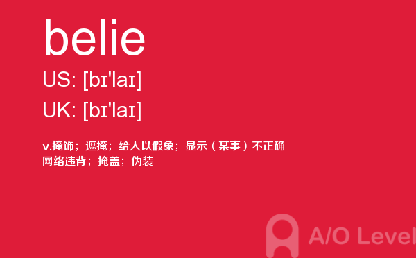 英国a-level入学考试的机会真的很少,每年就5-6月和10-11月两场考试。所以千万别因为不必要的原因,影响了a-level入学考试。为了让大家更好的在英国留学,a/o-level考试网会为大家带来a-level考试相关的资讯,一起来看看a/o-level考试网今天带来的词汇belie的解析。如果您想了解中国alevel成绩申请国外名校,alevel数学名词,英国alevel成绩只有c,alevel申请条件等关于a-level考试的相关资讯,请继续浏览并关注课窝a/o-level考试网。