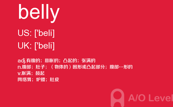 a-level的成绩分为a、b、c、d、e、u六个等级,a为最优,e为通过,u为不及格。如果学生对某门课的成绩不满意,可以选择重考,最终成绩以最好的一次为准。那么a-level考试想要取得a-level高分大家需要做到哪些呢?a/o-level考试网给大家带来的很多a-level考试经验,alevel考试技巧等等,想要考好a-level考试,不仅要知道这些,对于关于a-level考试的所有资讯都需要了解,最重点的是a-level词汇量的积累,今天a/o-level考试网就给大家带来的a-level的考试单词belly的全面解析。如果您想了解bc和alevel哪个好,国内知名alevel培训,alevel课程物理,a水准考试要求等关于a-level考试的相关资讯,请继续浏览并关注课窝a/o-level考试网。