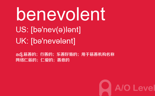 英国留学对于留学成绩的比拼越来越激烈,申请英国院校留学的一大指标a-level考试分数要求也水涨船高.虽然成绩只是申请的一部分,但不得不说,好看的英国a-level成绩是学生是否优秀的证据。放松一下跟着a/o-level考试网来学习一下a-level考试词汇benevolent的应用。如果您想了解上海alevel培训学校,澳大利亚alevel,alevel报名截止日期,爱德思alevel考试时间等关于a-level考试的相关资讯,请继续浏览并关注课窝a/o-level考试网。