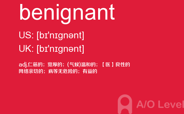 a-level的成绩分为a、b、c、d、e、u六个等级,a为最优,e为通过,u为不及格。如果学生对某门课的成绩不满意,可以选择重考,最终成绩以最好的一次为准。那么a-level考试想要取得a-level高分大家需要做到哪些呢?a/o-level考试网给大家带来的很多a-level考试经验,alevel考试技巧等等,想要考好a-level考试,不仅要知道这些,对于关于a-level考试的所有资讯都需要了解,最重点的是a-level词汇量的积累,今天a/o-level考试网就给大家带来的a-level的考试单词benignant的全面解析。如果您想了解alevel社会学,alevel考试满分,alevel真题下载,新加坡a水准预科等关于a-level考试的相关资讯,请继续浏览并关注课窝a/o-level考试网。