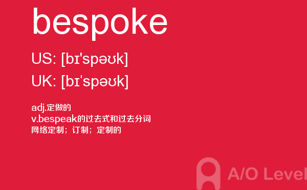 随着英国留学申请竞争的白热化,a-level成绩在学生个人简历中扮演的“入场券”角色,变得越来越重要。然而,在你参加a-level考试培训班前,你首先要对a-level考试有着一定的了解,一起跟着a/o-level考试网来看看小编今天带来a-level单词bespoke的详细介绍。如果您想了解alevel入学考试,alevel网校,alevel中文,alevel物理专业术语等关于a-level考试的相关资讯,请继续浏览并关注课窝a/o-level考试网。