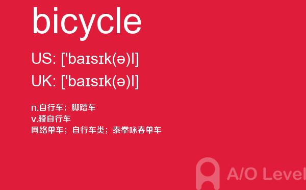 a-level课程证书被几乎所有英语授课的大学作为招收新生的入学标准。 在中国开设a-level课程旨在为中国学生提供进入国外大学的有效途径,具体目标为:培养在国内初高中成绩优秀的学生进入世界顶尖大学;培养在国内初高中成绩中等的学生进入世界一流大学;培养在国内初高中成绩一般的学生考取适合自己的大学。今天alevel考试网小编给大家详细解析a-level考试单词bicycle。如果您想了解新加坡alevel课程,港大alevel申请条件,alevel报名费用,alevel课程的劣势等关于a-level考试的相关资讯,请继续浏览并关注课窝a/o-level考试网。