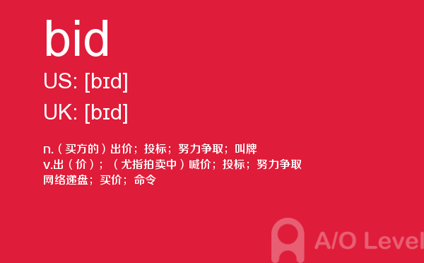 英国、加拿大、爱尔兰、澳大利亚、新西兰、新加坡等英语国家没有统一的大学入学标准,虽然它们都认可a-level证书,但是各所大学、各个专业对学生学过哪几门a-level课程以及成绩都有不同的要求。所以怎样选择课程并没有一个唯一的答案。对于如何选课的问题要根据具体情况而定。这些在你的a-level考试中都不是重要的,重要的是a-level成绩,a-level成绩取决于a-level词汇量,那么今天小编给大家带来a-level考试重点词汇bid的全面解析。如果您想了解英国alevel考试试卷,alevel真题搜索,alevel物理多少分是a,alevel真题网等关于a-level考试的相关资讯,请继续浏览并关注课窝a/o-level考试网。