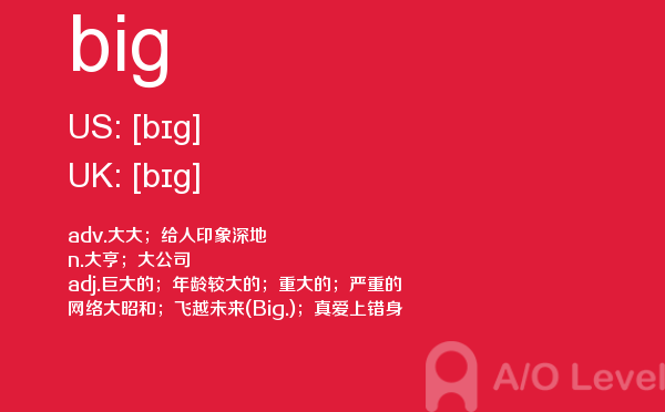 英国a-level考试是英国留学生去英国留学需要参加的考试,很多考生担心a-level考试分数要求高,英国a-level考试难度大,别担心,只要认真的学习a-level考试内容,小编相信大家一定能够考得a-level高分。今天a/o-level考试网给大家带来单词big的全面解析。如果您想了解交大alevel学费,新加坡a水准考试在哪考,中国alevel1月份考试,olevel和alevel的区别等关于a-level考试的相关资讯,请继续浏览并关注课窝a/o-level考试网。