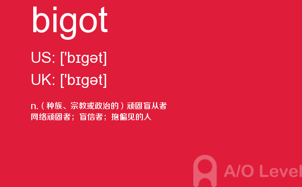 虽然英国a-level院校招生官常把“成绩不是决定录取与否的唯一因素”挂在嘴边,但不得不承认,a-level分数是学生优秀与否的有力证据,取得a-level成绩高分是肯定是优先考虑的。放松一下,先跟着a/o-level考试网来看看今天小编带来的是a-level单词bigot的介绍。如果您想了解alevel考试在中国,alevel物理分数线,alevel数学真题下载,alevel学校等关于a-level考试的相关资讯,请继续浏览并关注课窝a/o-level考试网。