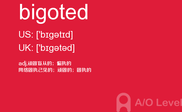 虽然英国a-level院校招生官常把“成绩不是决定录取与否的唯一因素”挂在嘴边,但不得不承认,a-level分数是学生优秀与否的有力证据,取得a-level成绩高分是肯定是优先考虑的。放松一下,先跟着a/o-level考试网来看看今天小编带来的是a-level单词bigoted的介绍。如果您想了解牛津大学alevel,上海alevel国际学校,alevel数学评分标准,alevel考试大纲等关于a-level考试的相关资讯,请继续浏览并关注课窝a/o-level考试网。