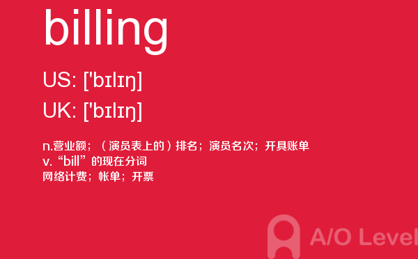 英国的大多数中学开设的alevel课程科目相当广泛,有文科、商科、经济、语言、数学、理科、计算、法律、媒体、音乐等。学生的alevel考试成绩及其所选修的a-level课程在很大程度上决定着能否进入理想的大学和学习所选择的学位课程。关于alevel考试alevel考试网会给大家带来和a-level考试相关的资讯,下面带来的是单词billing的介绍,会对大家的a-level考试成绩有帮助。如果您想了解上海alevel课程,美国大学alevel,alevel高二全球统考时间,alevel入学要求等关于a-level考试的相关资讯,请继续浏览并关注课窝a/o-level考试网。