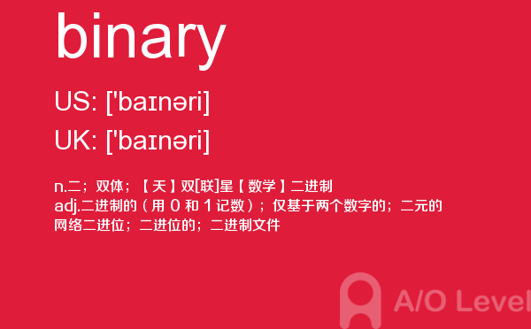 众多周知的英国a-level入学考试是进入英国院校的必经之路,所以我们自然不能小看,建议同学们能够加强a-level考试真题的练习,提前明确英国a-level考试报名的具体信息。为了提高考生们的英国a-level考试成绩,a/o-level考试网小编会每天给大家更新a-level留学资讯和alevel考试资讯,今天带来的是关于a-level考试词汇的单词全解,下面带你学习binary的用法。如果您想了解alevel是什么,alevel考试官方网站,英国alevel教材,英国alevel学校等关于a-level考试的相关资讯,请继续浏览并关注课窝a/o-level考试网。