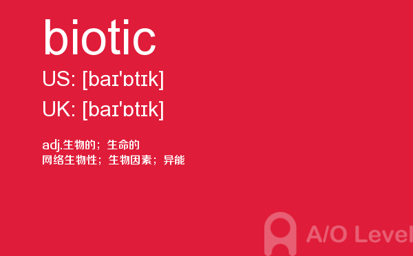 a-level课程包含70多门供学生选择,一般学生选择3至4门来学,中国学生在数学学科上有很大的优势,一般学生都会选择基础数学。学生选择课程时,一般要考虑现在自己的优势科目和将来的发展方向,即你想选择哪个大学、什么专业,从而根据他们的要求有的放矢地选课。关于alevel选课后续会详细介绍,下面带来a-level考试词汇biotic的详细介绍。如果您想了解alevel课程选择攻略,经济学alevel拿a难不难,alevel真题网,alevel在线学习等关于a-level考试的相关资讯,请继续浏览并关注课窝a/o-level考试网。