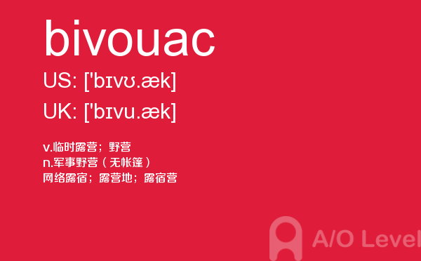 a-level(general certificate of education advanced level ),英国高中课程,是英国全民课程体系,是英国普通中等教育证书考试高级水平课程,也是英国学生的大学入学考试课程。今天alevel考试网小编给大家带来的alevel考试单词bivouac的详细介绍。希望大家能够认真的阅读。如果您想了解alevel写作真题,alevel写作分数,新加坡a水准报名费,新alevel等关于a-level考试的相关资讯,请继续浏览并关注课窝a/o-level考试网。