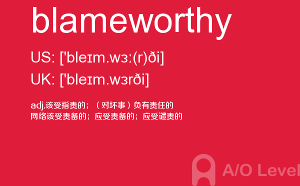 a-level的成绩分为a、b、c、d、e、u六个等级,a为最优,e为通过,u为不及格。如果学生对某门课的成绩不满意,可以选择重考,最终成绩以最好的一次为准。那么a-level考试想要取得a-level高分大家需要做到哪些呢?a/o-level考试网给大家带来的很多a-level考试经验,alevel考试技巧等等,想要考好a-level考试,不仅要知道这些,对于关于a-level考试的所有资讯都需要了解,最重点的是a-level词汇量的积累,今天a/o-level考试网就给大家带来的a-level的考试单词blameworthy的全面解析。如果您想了解alevel课程的适用范围,alevel国际学校,alevel考试日期,alevel经济学教材目录等关于a-level考试的相关资讯,请继续浏览并关注课窝a/o-level考试网。
