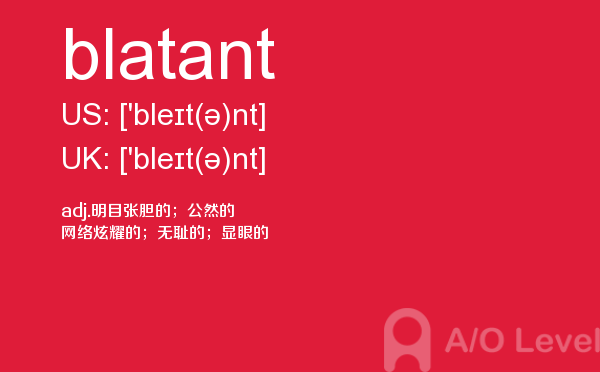 英国高中课程(a-level)的学制为两年:第一年称为as水准,学生通常选择自己最擅长且最有兴趣的3—4门课,通过考试后获得as证书。第二年称为a2水准,学生可选择as水准中优秀的3门课继续学习,通过考试后获得a-level证书。关于a-level学制相信大家肯定有一定的了解,今天alevel考试网想要带大家了解的并不是a-level学制的问题,想要介绍的是a-level重难点单词blatant,希望对大家有帮助。如果您想了解了解alevel辅导,alevel澳洲,爱德思alevel真题,alevel物理等关于a-level考试的相关资讯,请继续浏览并关注课窝a/o-level考试网。