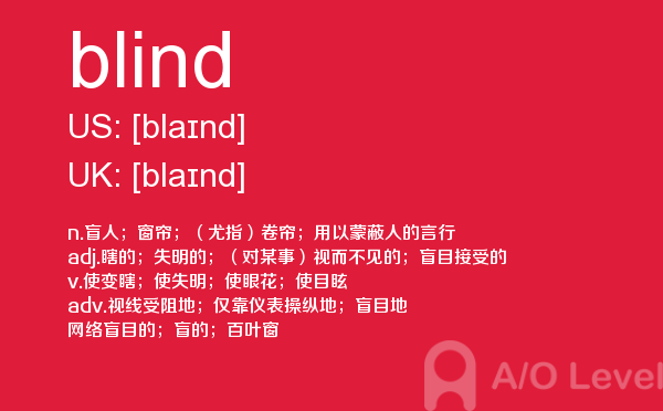随著学生的素质提升,各大a-level课程培训班的师资和英国a-level题库也不断的完善,近年来学生考出来a-level分数也不断上涨。但是去英国留学,对英国留学资讯和英国的a-level考试资讯都是需要了解的,下面一起跟着a/o-level考试网来看看a-level词汇之blind的详细介绍。如果您想了解新加坡a水准预科,查询alevel考试报名信息2018,alevel化学提纲,alevel考试介绍等关于a-level考试的相关资讯,请继续浏览并关注课窝a/o-level考试网。