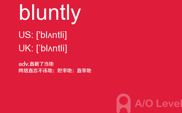 a- level课程一般在中国开设数学、进阶数学(或称高等数学)、物理、计算机学、会计学、商业学、经济学等课程供学生选择。那么关于alevel考生应该选哪些alevel课程呢?以后会给大家详细介绍,今天a/o-level考试网主要给大家全面介绍a-level词汇中的bluntly单词。如果您想了解alevel考试卷,alevel化学知识点,alevel试题,用alevel成绩申请大学等关于a-level考试的相关资讯,请继续浏览并关注课窝a/o-level考试网。