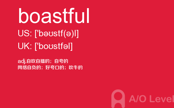 英国a-level学校,从教学质量上来看私立学校更占优势,大部分中国留学生也选择私立学校来读,不过一般都是提前一年来申请学校。中国目前也有20几所a-level学校,每年也同样有走进剑桥牛津等世界顶级大学的学生。所以在国外和在国内都可以选择a-level学校来学习。在前面关于a-level选校的问题已经详细介绍过,那么今天a/o-level考试网小编主要想介绍的是a-level重难点词汇boastful。希望对大家有帮助。如果您想了解alevel证书,爱德思alevel真题,alevel经济2017试卷,新加坡alevel等关于a-level考试的相关资讯,请继续浏览并关注课窝a/o-level考试网。
