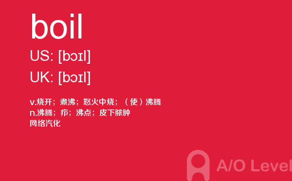 a-level课程证书被几乎所有英语授课的大学作为招收新生的入学标准。 在中国开设a-level课程旨在为中国学生提供进入国外大学的有效途径,具体目标为:培养在国内初高中成绩优秀的学生进入世界顶尖大学;培养在国内初高中成绩中等的学生进入世界一流大学;培养在国内初高中成绩一般的学生考取适合自己的大学。今天alevel考试网小编给大家详细解析a-level考试单词boil。如果您想了解国内alevel培训,alevel历年考试,alevel学校考试难度,alevel报考等关于a-level考试的相关资讯,请继续浏览并关注课窝a/o-level考试网。