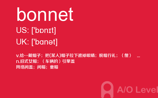 在a-level备考的过程中,想要冲刺到a-level写作的高分,相信大家都应该会知道,除了需要掌握a-level写作的一些技巧之外,优化文章中的词汇和句型也是冲刺高分的关键所在。也就是说,只有充分掌握了语法知识,才能让我们的的文章更为丰富形象。除了a-level写作,在a-level其他方面同学们也需要了解,下面课窝a/o-level考试网小编给大家带来a-level单词bonnet的介绍。如果您想了解a水准考试预备班怎么样,化学alevel2018,alevel官方介绍,alevel课程选课等关于a-level考试的相关资讯,请继续浏览并关注课窝a/o-level考试网。