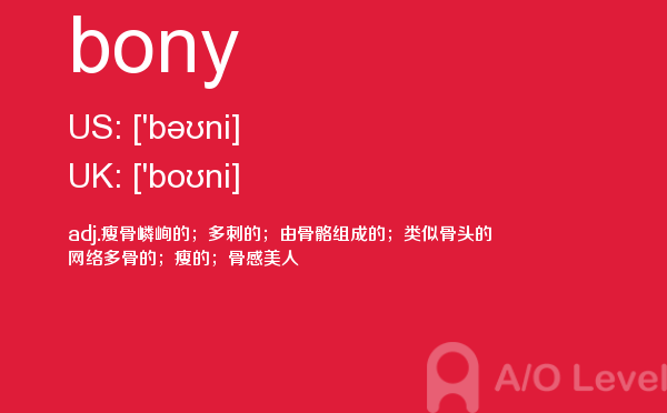 目前,a/olevel逐渐为人所熟知,很多学生都会主动了解alevel考试流程。同时也会抱怨a-level英语题比较难,任务重。那现在我们就放松一下,跟着a/o-level考试网小编来看看a-level考试中要积累的单词bony,认真的学习积累。如果您想了解alevel国际班,alevel入学考试,alevel考试地点,alevel考试辅导等关于a-level考试的相关资讯,请继续浏览并关注课窝a/o-level考试网。