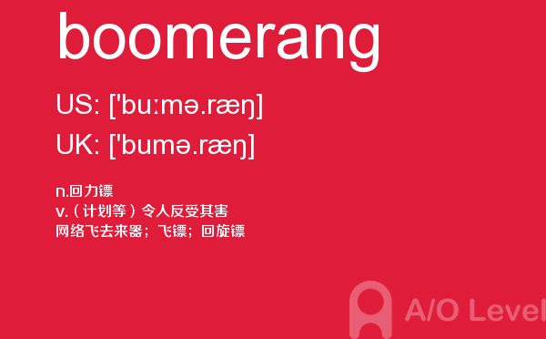 a-level课程证书被几乎所有英语授课的大学作为招收新生的入学标准。 在中国开设a-level课程旨在为中国学生提供进入国外大学的有效途径,具体目标为:培养在国内初高中成绩优秀的学生进入世界顶尖大学;培养在国内初高中成绩中等的学生进入世界一流大学;培养在国内初高中成绩一般的学生考取适合自己的大学。今天alevel考试网小编给大家详细解析a-level考试单词boomerang。如果您想了解alevel课程可以申请留学新加坡吗,alevel中文书目,alevel词汇量,alevel参考书等关于a-level考试的相关资讯,请继续浏览并关注课窝a/o-level考试网。