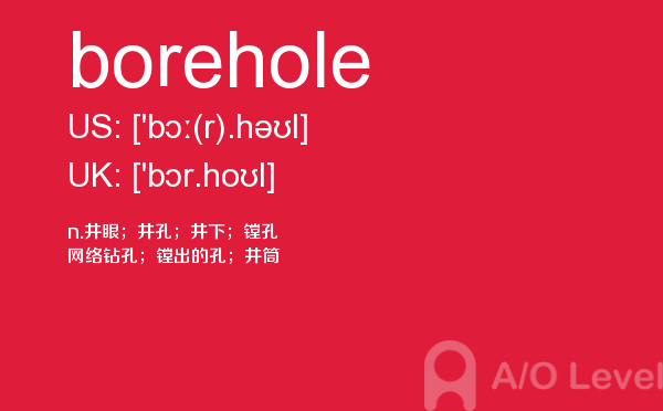 随著学生的素质提升,各大a-level课程培训班的师资和英国a-level题库也不断的完善,近年来学生考出来a-level分数也不断上涨。但是去英国留学,对英国留学资讯和英国的a-level考试资讯都是需要了解的,下面一起跟着a/o-level考试网来看看a-level词汇之borehole的详细介绍。如果您想了解了解alevel培训,国际部高中课程alevel,查询alevel考试报名信息2018,墨尔本大学alevel要求等关于a-level考试的相关资讯,请继续浏览并关注课窝a/o-level考试网。