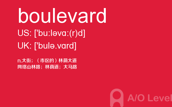 a-level课程证书被几乎所有英语授课的大学作为招收新生的入学标准。 在中国开设a-level课程旨在为中国学生提供进入国外大学的有效途径,具体目标为:培养在国内初高中成绩优秀的学生进入世界顶尖大学;培养在国内初高中成绩中等的学生进入世界一流大学;培养在国内初高中成绩一般的学生考取适合自己的大学。今天alevel考试网小编给大家详细解析a-level考试单词boulevard。如果您想了解中国alevel成绩申请国外名校,alevel数学名词,英国alevel成绩只有c,alevel申请条件等关于a-level考试的相关资讯,请继续浏览并关注课窝a/o-level考试网。