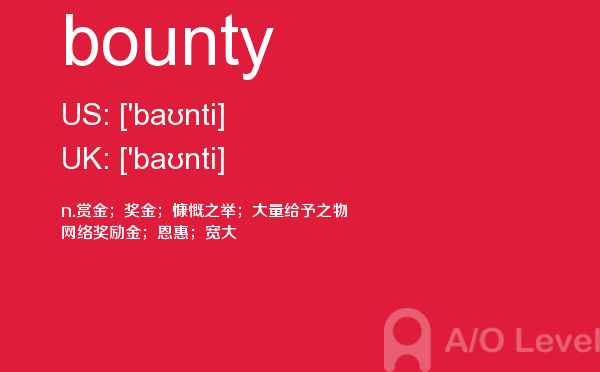 英国高中课程(a-level)的学制为两年:第一年称为as水准,学生通常选择自己最擅长且最有兴趣的3—4门课,通过考试后获得as证书。第二年称为a2水准,学生可选择as水准中优秀的3门课继续学习,通过考试后获得a-level证书。关于a-level学制相信大家肯定有一定的了解,今天alevel考试网想要带大家了解的并不是a-level学制的问题,想要介绍的是a-level重难点单词bounty,希望对大家有帮助。如果您想了解alevel经济essay,alevel成绩有效期,alevel进阶数学分数段,什么是alevel课程等关于a-level考试的相关资讯,请继续浏览并关注课窝a/o-level考试网。