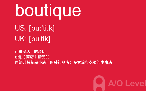 英国高中课程(a-level)的学制为两年:第一年称为as水准,学生通常选择自己最擅长且最有兴趣的3—4门课,通过考试后获得as证书。第二年称为a2水准,学生可选择as水准中优秀的3门课继续学习,通过考试后获得a-level证书。关于a-level学制相信大家肯定有一定的了解,今天alevel考试网想要带大家了解的并不是a-level学制的问题,想要介绍的是a-level重难点单词boutique,希望对大家有帮助。如果您想了解alevel经济essay,alevel成绩有效期,alevel进阶数学分数段,什么是alevel课程等关于a-level考试的相关资讯,请继续浏览并关注课窝a/o-level考试网。