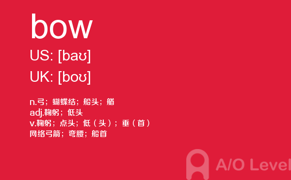 随著学生的素质提升,各大a-level课程培训班的师资和英国a-level题库也不断的完善,近年来学生考出来a-level分数也不断上涨。但是去英国留学,对英国留学资讯和英国的a-level考试资讯都是需要了解的,下面一起跟着a/o-level考试网来看看a-level词汇之bow的详细介绍。如果您想了解alevel报名考试,alevel水平考试,墨尔本大学alevel,a水准h1和h2等关于a-level考试的相关资讯,请继续浏览并关注课窝a/o-level考试网。
