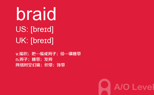 虽然英国a-level院校招生官常把“成绩不是决定录取与否的唯一因素”挂在嘴边,但不得不承认,a-level分数是学生优秀与否的有力证据,取得a-level成绩高分是肯定是优先考虑的。放松一下,先跟着a/o-level考试网来看看今天小编带来的是a-level单词braid的介绍。如果您想了解alevel数学真题下载,alevel教材在哪里买,alevel课程教案,新加坡a水准考试条件等关于a-level考试的相关资讯,请继续浏览并关注课窝a/o-level考试网。