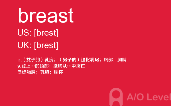 a-level(general certificate of education advanced level ),英国高中课程,是英国全民课程体系,是英国普通中等教育证书考试高级水平课程,也是英国学生的大学入学考试课程。今天alevel考试网小编给大家带来的alevel考试单词breast的详细介绍。希望大家能够认真的阅读。如果您想了解alevel会计辅导,alevel考试培训,alevel物理教材pdf,a水准考试预备班等关于a-level考试的相关资讯,请继续浏览并关注课窝a/o-level考试网。