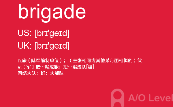 a-level 的考试将由所属的考试委员会分别于每年5-6月和10-11月在全球统一组织,成绩分别在8月和次年2月公布。关于a-level考试时间的具体内容,alevel考试网前面详细介绍过,大家可以查找alevel考试网前面的a-level考试资讯,alevel考试网每天会更新大量的alevel考试资讯,本篇要给大家介绍a-level单词brigade的全面介绍。如果您想了解alevel考试地点,alevel中文,出国留学alevel成绩培训,a水准考试预科班等关于a-level考试的相关资讯,请继续浏览并关注课窝a/o-level考试网。