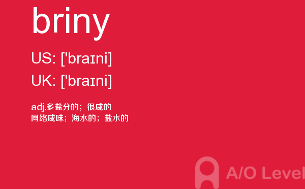 随著学生的素质提升,各大a-level课程培训班的师资和英国a-level题库也不断的完善,近年来学生考出来a-level分数也不断上涨。但是去英国留学,对英国留学资讯和英国的a-level考试资讯都是需要了解的,下面一起跟着a/o-level考试网来看看a-level词汇之briny的详细介绍。如果您想了解了解alevel培训,国际部高中课程alevel,查询alevel考试报名信息2018,墨尔本大学alevel要求等关于a-level考试的相关资讯,请继续浏览并关注课窝a/o-level考试网。