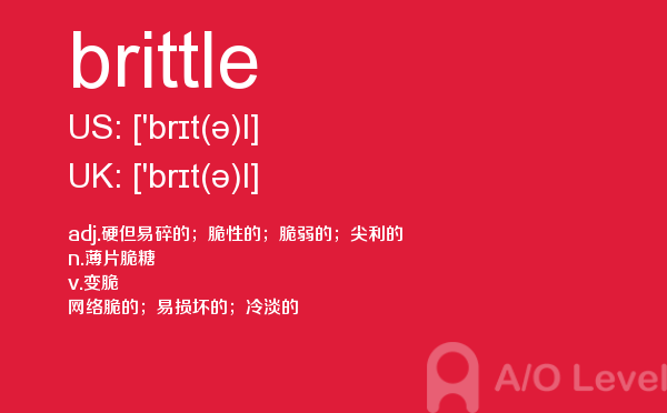 英国a-level入学考试的机会真的很少,每年就5-6月和10-11月两场考试。所以千万别因为不必要的原因,影响了a-level入学考试。为了让大家更好的在英国留学,a/o-level考试网会为大家带来a-level考试相关的资讯,一起来看看a/o-level考试网今天带来的词汇brittle的解析。如果您想了解alevel网上报名,alevel国际课程介绍,新加坡a水准学费,alevel范文等关于a-level考试的相关资讯,请继续浏览并关注课窝a/o-level考试网。