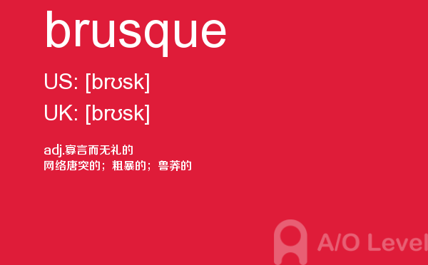 a-level的成绩分为a、b、c、d、e、u六个等级,a为最优,e为通过,u为不及格。如果学生对某门课的成绩不满意,可以选择重考,最终成绩以最好的一次为准。那么a-level考试想要取得a-level高分大家需要做到哪些呢?a/o-level考试网给大家带来的很多a-level考试经验,alevel考试技巧等等,想要考好a-level考试,不仅要知道这些,对于关于a-level考试的所有资讯都需要了解,最重点的是a-level词汇量的积累,今天a/o-level考试网就给大家带来的a-level的考试单词brusque的全面解析。如果您想了解alevel机构,南京最好的alevel培训机构,alevel数学题,alevel考试形式等关于a-level考试的相关资讯,请继续浏览并关注课窝a/o-level考试网。