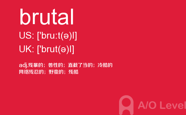 虽然英国a-level院校招生官常把“成绩不是决定录取与否的唯一因素”挂在嘴边,但不得不承认,a-level分数是学生优秀与否的有力证据,取得a-level成绩高分是肯定是优先考虑的。放松一下,先跟着a/o-level考试网来看看今天小编带来的是a-level单词brutal的介绍。如果您想了解牛津大学alevel,上海alevel国际学校,alevel数学评分标准,alevel考试大纲等关于a-level考试的相关资讯,请继续浏览并关注课窝a/o-level考试网。
