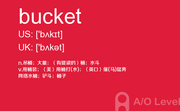 英国高中课程(a-level)的学制为两年:第一年称为as水准,学生通常选择自己最擅长且最有兴趣的3—4门课,通过考试后获得as证书。第二年称为a2水准,学生可选择as水准中优秀的3门课继续学习,通过考试后获得a-level证书。关于a-level学制相信大家肯定有一定的了解,今天alevel考试网想要带大家了解的并不是a-level学制的问题,想要介绍的是a-level重难点单词bucket,希望对大家有帮助。如果您想了解alevel课程选课,考alevel多少钱,上海alevel辅导哪家好,alevel经济考试原题等关于a-level考试的相关资讯,请继续浏览并关注课窝a/o-level考试网。